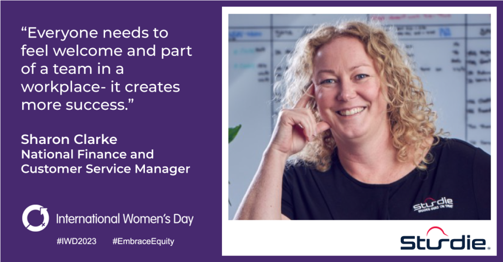 International Women’s Day is a day to celebrate women’s achievements and increase their visibility while calling for action to accelerate women’s equality. In her new role as National Finance & Customer Service Manager, Sharon Clarke inspires collaboration, innovation, team culture and efficiency amongst the Sturdie team to ensure the high-quality delivery of service and maintenance with maximum client satisfaction. For Sharon, embracing equity is vital for the workplace – “Everyone needs to feel welcome and part of a team in a workplace- it creates more success.”“It’s about embracing equality and inclusivity, no matter who you are. It’s about being harmonious.” Reflecting on her 16 years with Sturdie, Sharon believes a great supportive team and culture, and an appetite to learn, has been the secret to her success. It’s this ethos which has seen Sharon master multiple roles within the company before her most recent promotion. “I’ve had really good support throughout my whole time here. There is a good culture so it makes it more fun to be here. I’m learning new things all the time – there’s always something to learn! It’s been an experience and I’m looking forward to my next big challenge!”